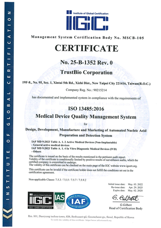 TrustBio Corporation was established in 2022 and is focused on providing simple, fast, and affordable tools for molecular diagnosis and cancer screening. TrustBio is also a customer oriented company in a wide range of portfolios, from sample preparation to downstream applications, smart and reliable IVD & Research tools. Our team is composed of managers with over 20 years’ experience in developing and manufacturing reagents and platforms for molecular diagnostic assays that guarantee the most optimal solutions to help our partners to reach their goals. Our aim is to be a leading biotechnology company offering complete solutions to meet all of customer needs.