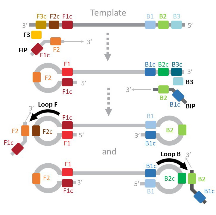 - Initiation: The outer primers initiate the synthesis of the DNA strand, which is then displaced by the inner primers. This creates single-stranded DNA loops at each end.